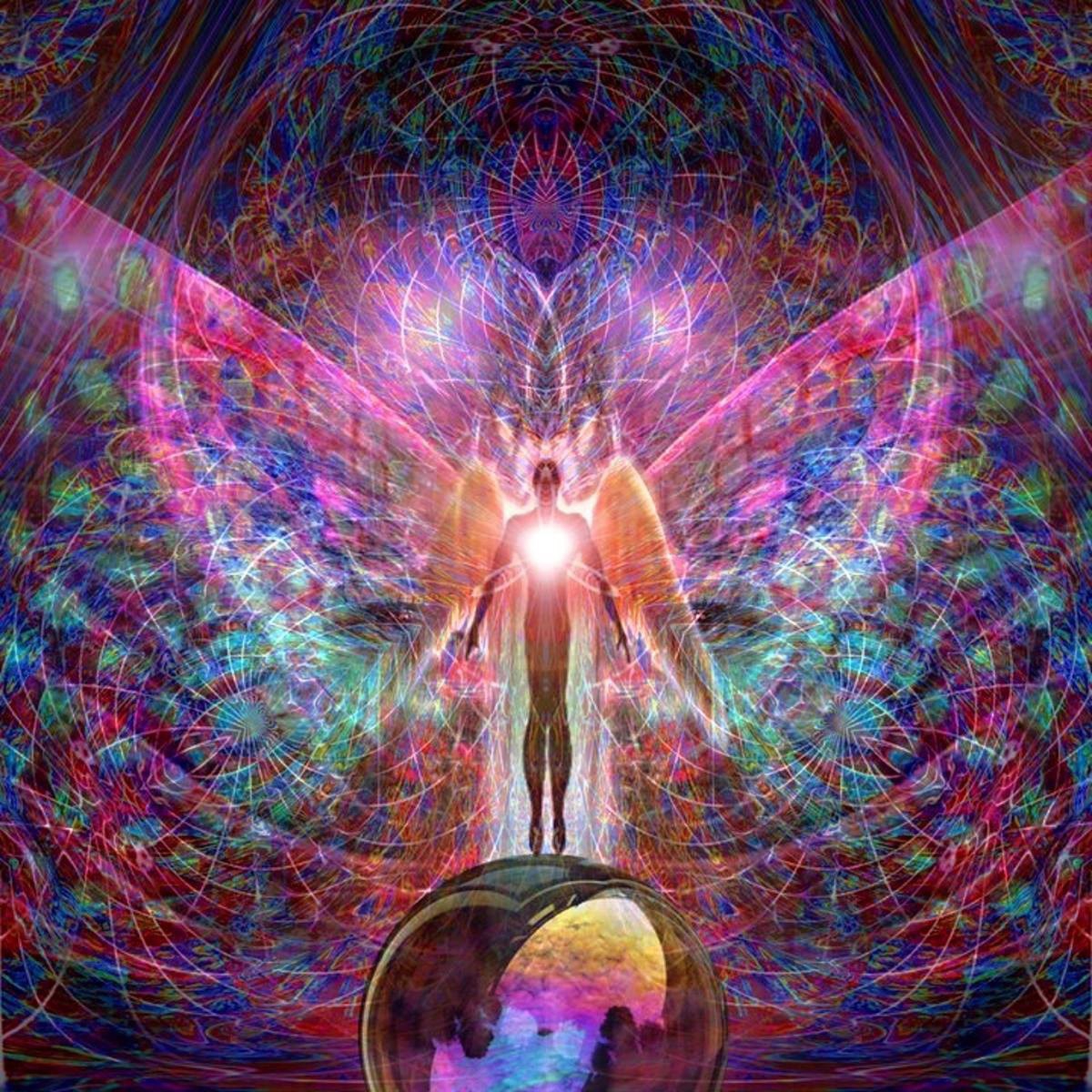 Přeneste své vědomí ke křišťálové pyramidě s energií Mahátma. Po zářivých schodech vystoupejte k ní. U jejího vchodu plápolají zlatobílé plameny. Jejím vrcholkem prochází panel tohoto světla, který jde skrz a pokračuje, až do Země. Vejdete dovnitř a vnímáte tu krásu. Energie Mahátma v sobě mísí všechny paprsky. Vstupte do panelu zářícího zlato-bílého světla. Vnímejte světlo všude kolem vás i ve vás. Vizualizujte si, jak vám do temene sestupuje zlatobílá koule světla. Nechejte ji procházet každou svou žlázou. Proudí do šišinky mozkové na temeni hlavy, do hypofýzy ve třetím oku, do štítné žlázy v krční čakře, do brzlíku v srdeční čakře, do slinivky v solárním plexu, do pohlavních žláz, vaječníků a varlat v sakrální čakře a do nadledvinek v kořenové čakře. Vnímejte, jak se koule zlato-bílého světla zastavuje v každé čakře a zde působí, hřeje, vibruje, léčí a přeměňuje. Poté energie Mahátma prostupuje i vaší zemskou hvězdou a proudí hluboko do nitra země.