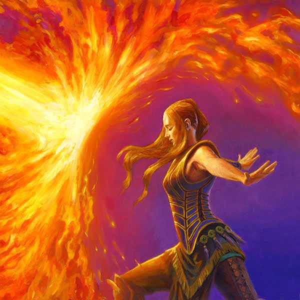 Přesuňte své vědomí do Chrámu Ohně. Tento chrám jakoby byl celý z plamínků. Může být také v přírodě, kde se mezi kameny nachází uprostřed hlavní krystal tohoto chrámu, a sice červený Rubín. Všude je oheň. Jste jím fascinováni. Pozorujete ho i létající jiskřičky kolem. Vnímáte zvuk a teplo ohně. Jiskry padají na vaši auru, naplňují ji a proměňují ve zlatý plamen. Stáváte se zlatým plamenem, který spaluje vše staré a nepotřebné. Vdechujte kvality ohně a ukotvujte v sobě tento element. Vnímáte bytosti ohně, salamandry, jak poskakují kolem. Můžete se přidat k nim. Element ohně to jsou plameny, světlo - stvoření a já jsme jedno. Oheň zapaluje, rozkládá a mění, plameny a pochodně osvětlují naši cestu. Tajemství ohně tkví ve věčném plameni, v našem srdci a duchu. Tvoř a měň a poznáš Boha v sobě. Můžete vstoupit do rubínového krystalu uprostřed chrámu a vnímat jak vašimi čakrami prolétává symbol pyramidy barvy červené, oranžové, žluté, fialové, modré či černé. Poté usedněte na jeden z trůnů a vnímejte, jak strážce tohoto chrámu vám dává na hlavu korunu s trojúhelníky či plamínky, která může být poseta rubíny či ohnivými opály. Dostáváte i žezlo či pochodeň, plášť, přívěsek, na třetí oko symbol. Vnímáte ohnivou - tvořivou sílu ve svém těle i kolem něj.